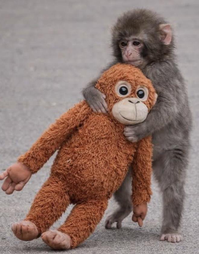 A baby animal hugging a plush toy creates instant emotional engagement.